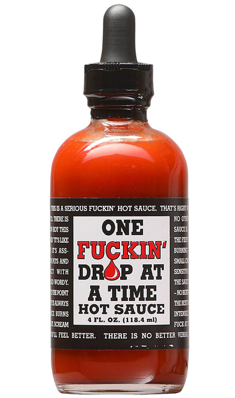 One Fuckin' Drop At A Time Hot Sauce, 4oz.: This is a serious hot sauce. There is no other way to describe just how hot this sauce is. Keep away from pets and small children and avoid contact with sensitive areas. When this sauce burns intensely. Use the supplied inside glass dropper for your controlled measurements.