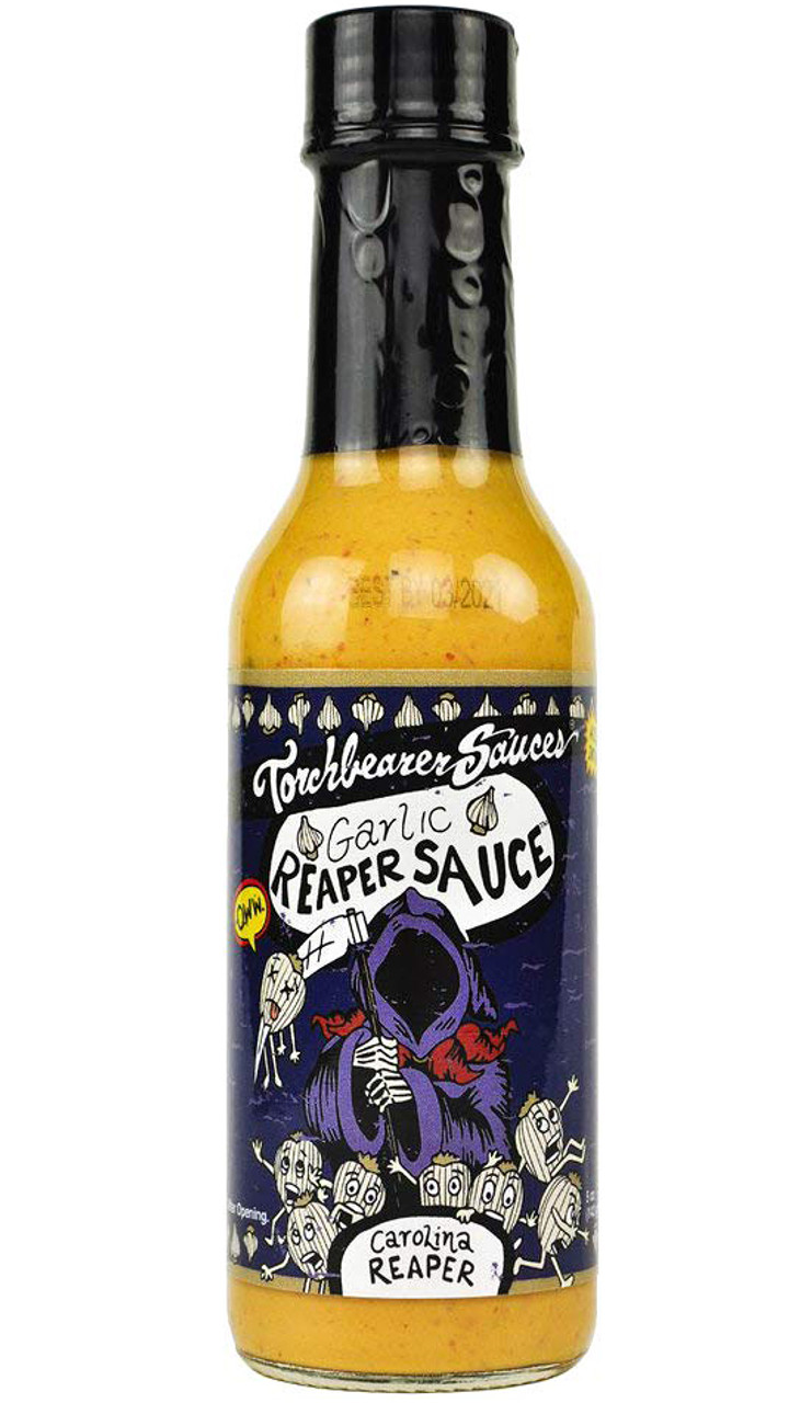 Torchbearer Garlic Carolina Reaper Hot Sauce, 5oz.: (Featured on Season 8 of Hot Ones) As our biggest sauce of 2019, the Garlic Reaper is quite the showman. The first ingredient in this hot sauce is Carolina Reaper and the second is garlic. The result; both HEAT and FLAVOR. The Garlic Reaper is unlike anything you’ve ever had, with its creamy texture from a rich oil base and just enough savory spices to round out that garlic. Some would say it’s the best pizza sauce EVER but we also love it on burritos or as a pasta sauce. It can even make a great marinade or sandwich topper for those who can handle it. Order a bottle (or case!) of the Garlic Reaper. We promise you will not regret it. Perfect For: Wings, Pizza, Chicken SaladThis All Natural, Gluten-Free, Vegetarian, Made in the USA, EXTRACT-FREE sauce uses REAL Carolina Reapers and Garlic in every bottle! Featured on Hot Ones! This Garlic Reaper hot sauce combines Carolina Reaper Peppers, Garlic, Canola Oil, Vinegar, Lime Juice, Mustard Powder, Chili Powder and Salt to create a creamy texture and savory taste that is IRRESISTIBLE.