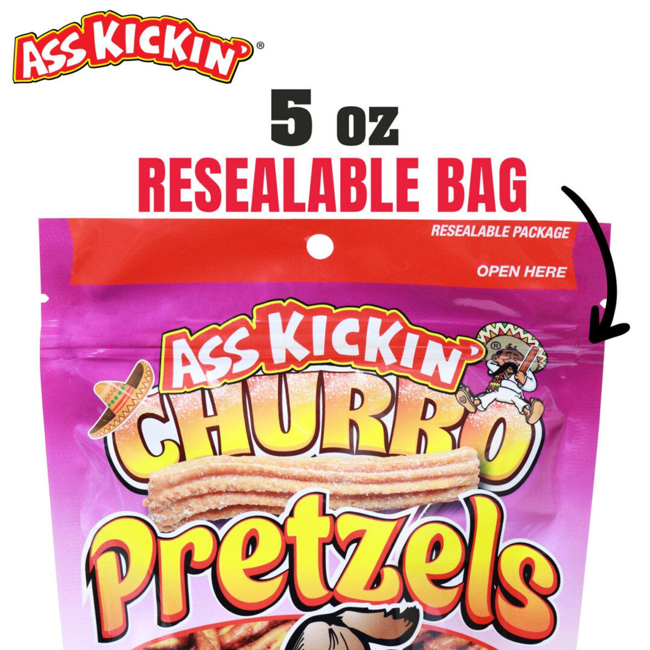 Ass Kickin Churro Pretzels, 5oz.: Not Spicy! Indulge your sweet tooth with Ass Kickin’ Churro pretzel twists! These delicious pretzels are coated in a perfect churro blend of cinnamon and sugar, creating a irresistible flavor combination that will satisfy any craving. Perfect for satisfying your sweet tooth for a sugary snack without any heat. These pretzel twists are a must have for any churro lover.