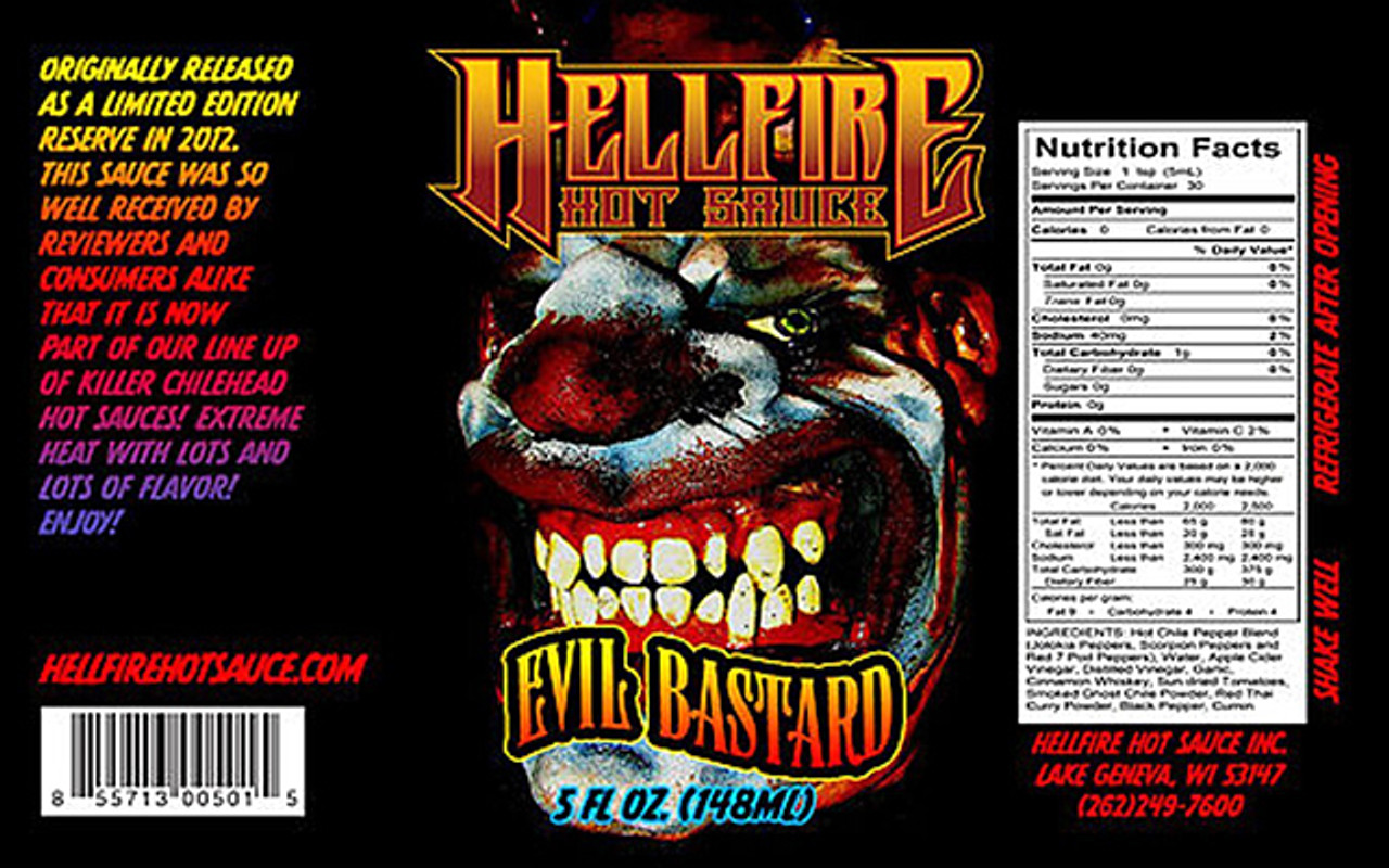 Hellfire Evil Bastard Hot Sauce, 5oz.: If you've tried this sauce before you know what it is! Smokey and freaking hot! Very Hot and Very Tasty! If you've visited us at the hot sauce shows and festivals you know it as our "secret sauce"! It good ,it's hot and it's all natural! Enjoy!!!! Infused with Jack Daniels Fire Whisky!