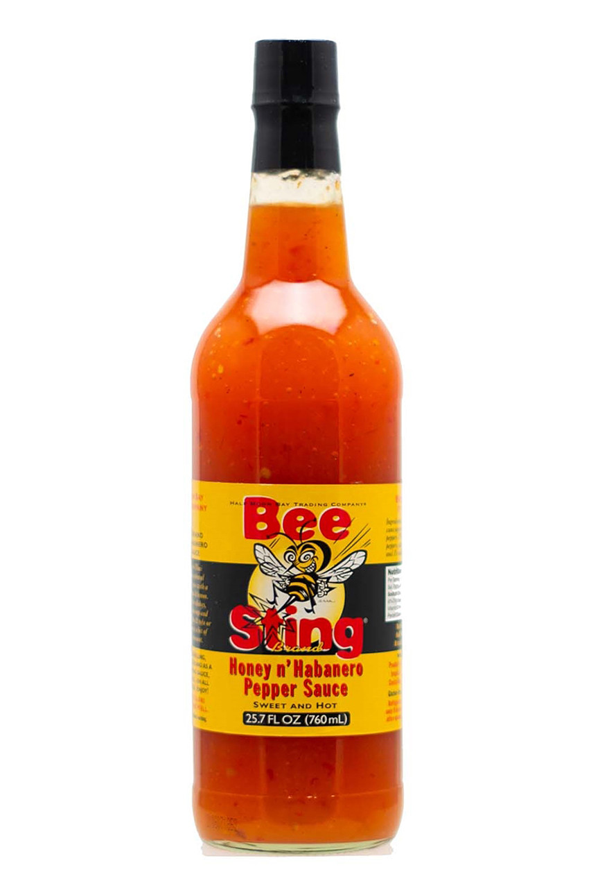 Bee Sting Honey & Habanero Hot Sauce, 25.7oz.: Bee Sting Brand, It's A Real Buzz! CAUTION: This bee stings without warning. Sweet and Hot. This is an Asian-Thai influenced, pan-cultural sweet-hot pepper sauce with a hint of garlic, onion, and lemon. You've heard of the infamous Africanized Killer Bees v we've turned the tables on these prolific honey producers, which are actually the predominant bee species in the rainforests of Costa Rica, by tapping into their golden harvest to produce BeeSting Honey N' Habanero Pepper Sauce. Like honey to a bee, this sweet-hot concoction is a soothing, satisfying complement to your favorite dishes. Bee Sting Honey N' Habanero is excellent with rice dishes, curries, chicken, shrimp and steak, with vegetables and tofu or anywhere you want a bit of Asian-style excitement. No artificial colors or flavors. Also great for grilling, marinades & glazes. And as a splashing & dipping sauce. Caution: This bee stings without warning.