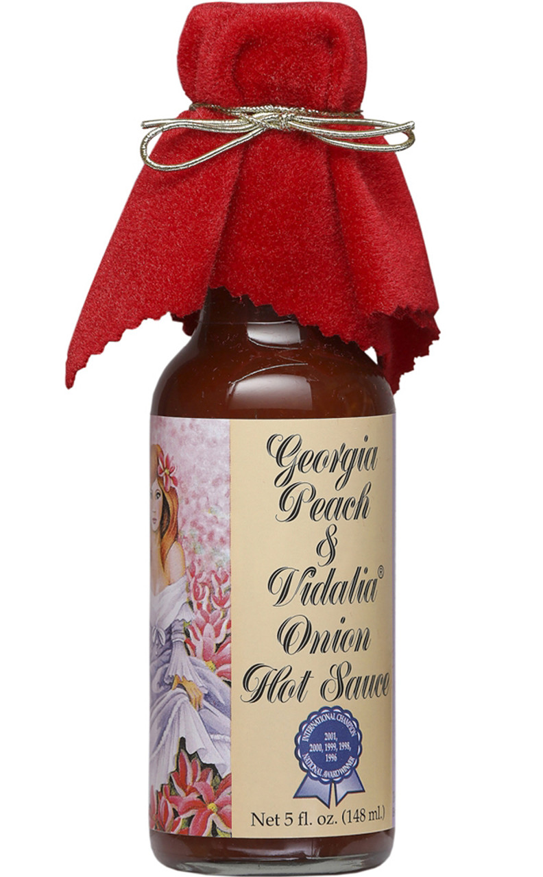 Georgia Peach & Vidalia Onion Hot Sauce with Red Velvet Top, 5oz.: The famous sauce that goes well with all foods. Fantastic with breakfast dishes such as scrambled eggs. Great on fresh seafood, as a wing sauce or with all meat concepts.