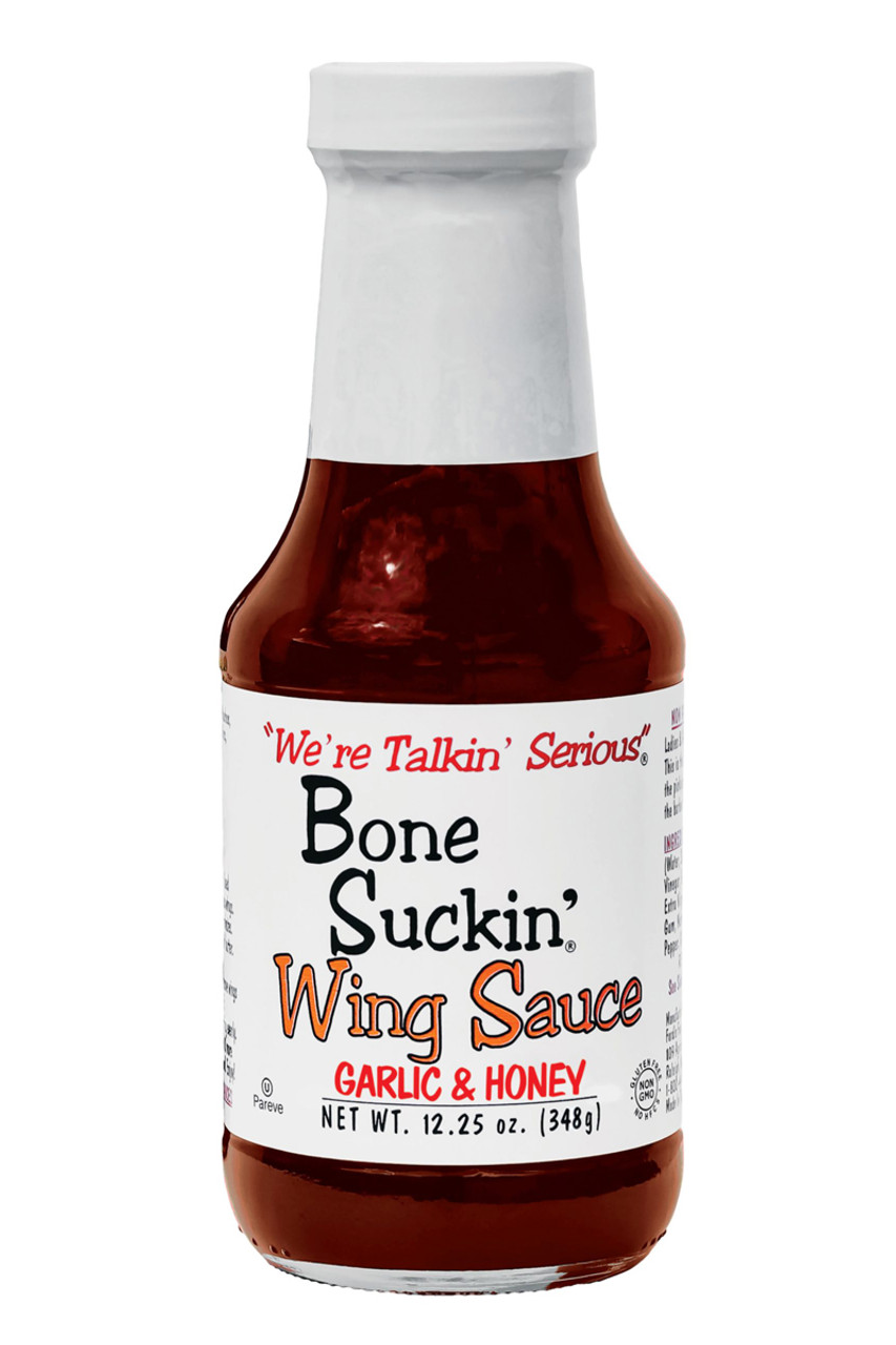 Bone Suckin Garlic & Honey Wing Sauce, 12.25oz. Smell the aroma of garlic and enjoy the sweet taste of honey while your family devours the chicken wings! Bone Suckin' Garlic & Honey Wing Sauce will quickly become your favorite!