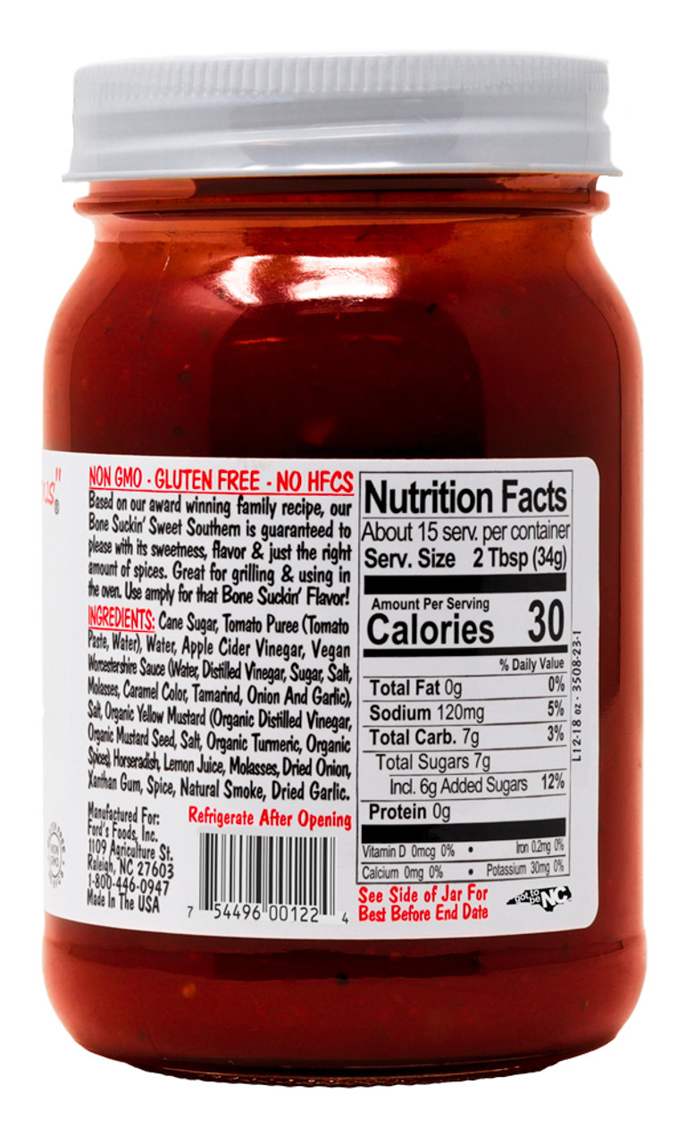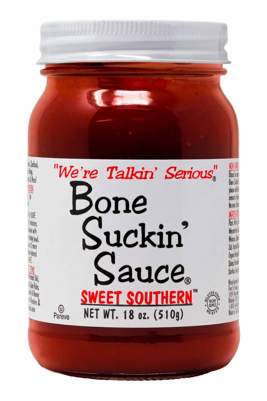 Bone Suckin Sweet Southern Original Barbecue Sauce, 18oz.: Bone Suckin' Sauce is the serious barbecue, grilling & marinating sauce for land & sea. Use amply for that Bone Suckin' flavor! Bone Suckin' Sauce is sweetened with honey & molasses with an irresistible flavor. All Natural, Kosher, Fat Free, Gluten Free, Non Gmo & No High Fructose Corn Syrup. Ever. Once you try our sauce you will never buy another barbecue sauce.
