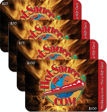 HotSauce.com e-Gift Cards are the perfect Hot Sauce Gift, regardless of the occasion. Choose any amount from $5 to $5000, redeemable toward thousands of hot sauce and fiery foods products. HotSauce.com e-Gift Cards never expire and they are delivered fast and free to the lucky recipient. All e-Gift Cards are activated and emailed to your recipients email address specified in the e-Gift Card order screen within 24 hours and may be applied immediately to your recipients future hot sauce order.