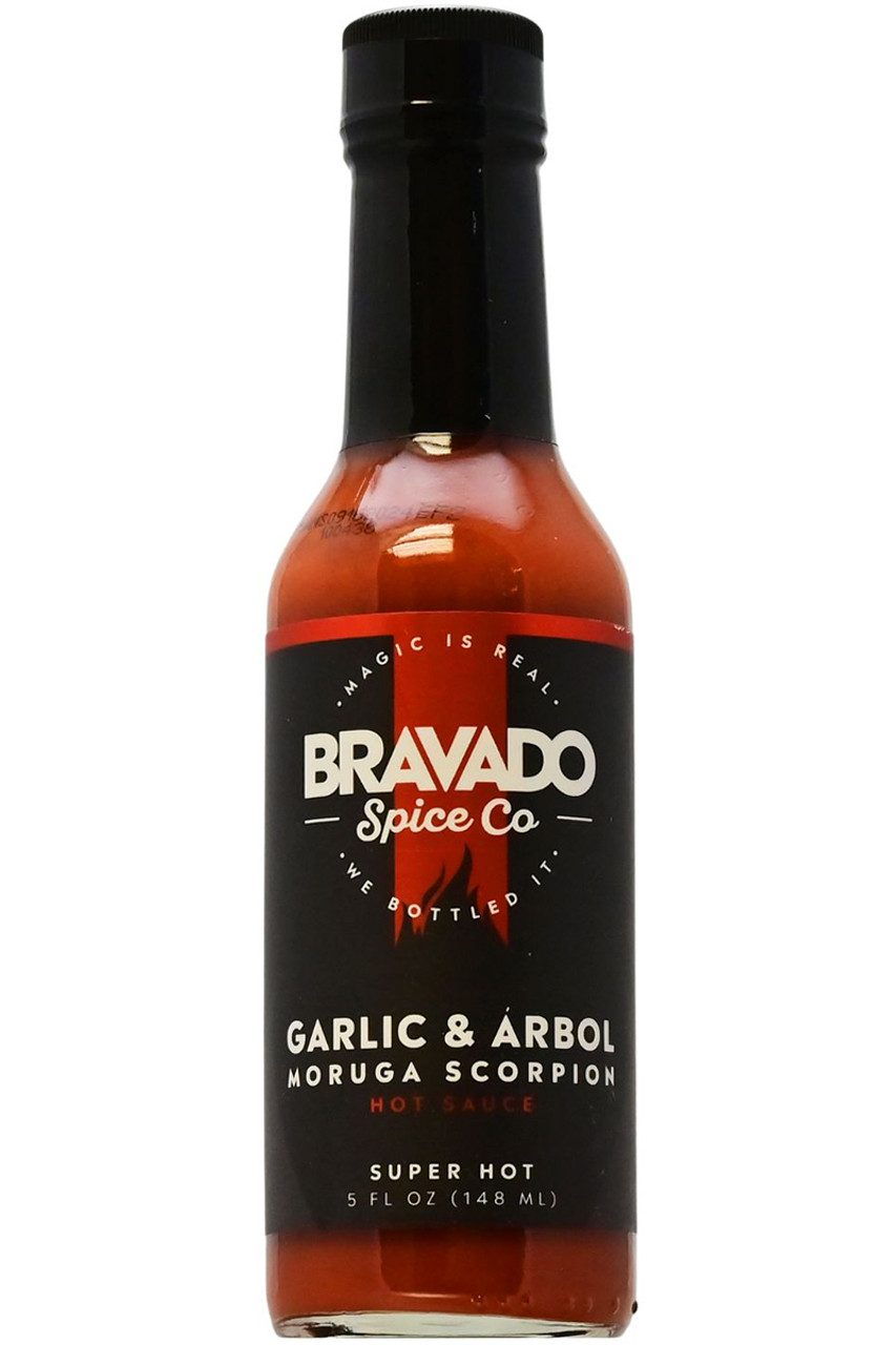 Bravado Spice Co. Garlic and Arbol Moruga Scorpion Hot Sauce, 5oz.: A fiery, garlicky blend of scorpion peppers, Árbol Chilis, and a hint of lime. This is a true ultra hot from deep in the heart of Texas!