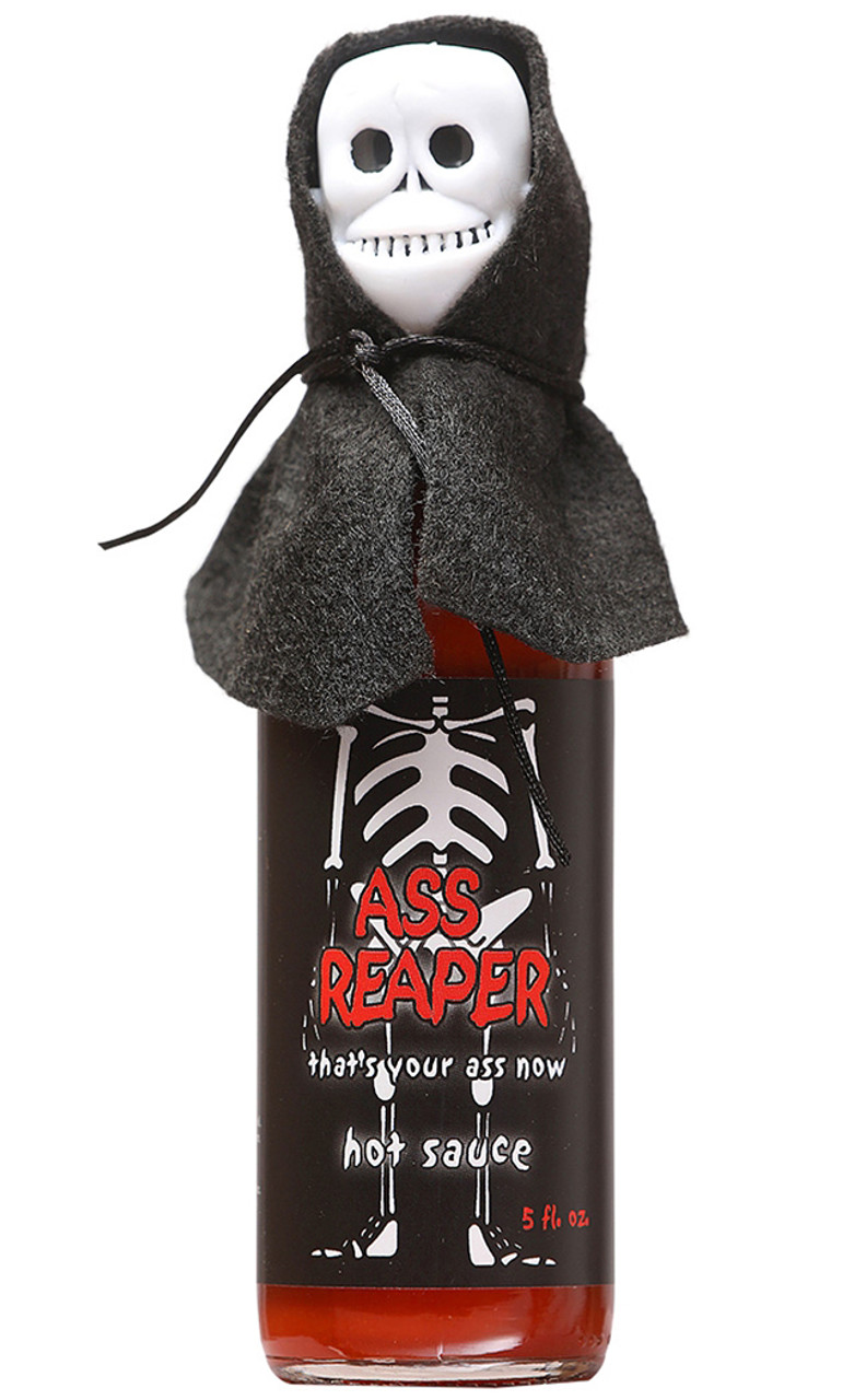 Ass Reaper Hot Sauce with Skull Cap and Cape, 5oz.: One of the hottest and neatest collectables to come along in a long time. A freightening addition to any hot sauce collection. Perfect for halloween as a party gift.