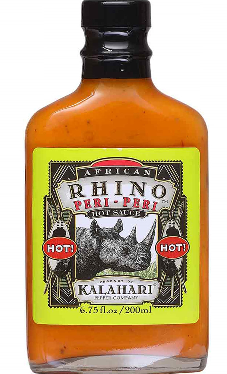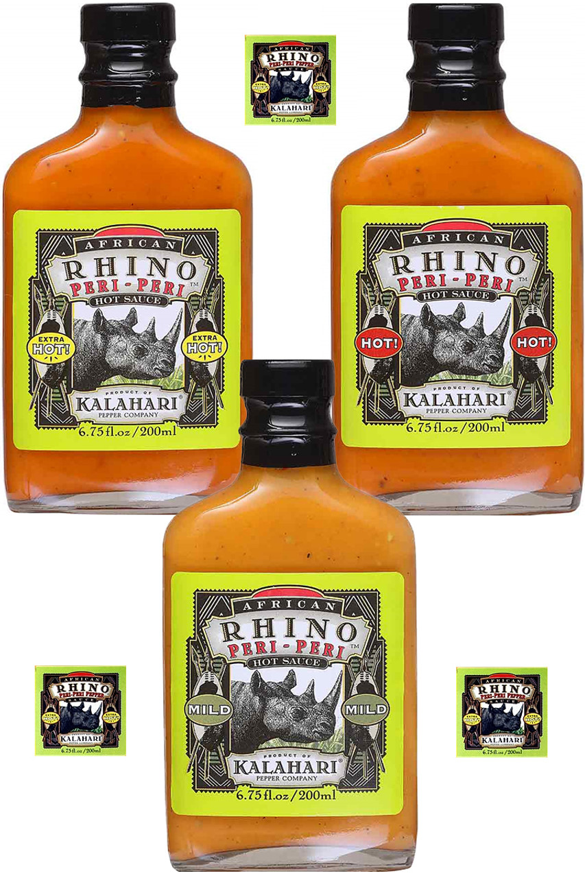 African Rhino Peri Peri Gift Set, 3/6.75oz.: This African Rhino Gift Set will run you down and stick its horn in ya like the wild beast Rhino. The exotic Peri-Peri is Africa's hottest chili pepper. Strains from Botswana and Mozambique are grown exclusively for the Kalahari Pepper Company so you too can experience the soul of Africa's "Great Thirstland," the Kalahari Desert. This sauce is great on all meats, seafood or poultry dishes.