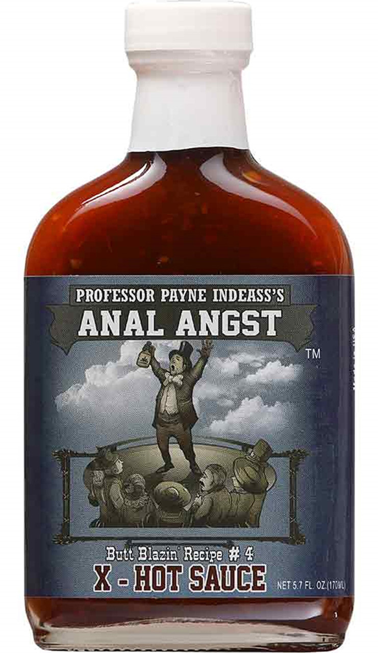 Anal Angst X-Hot Hot Sauce, 5.7oz.: Butt Blazin recipe #4 - Ladies & Gentlemen! After years of perfecting my formulations, I have achieved precisely that. Everyone gather around so you don't miss this offer! It's hot, it's delicious, and it will change your life; Professor Payne Indeass' collection of sensational hot sauces! Take notes, because Sphincter Shrinker, Butt Pucker, Anal Angst, Flamin' Flatulence and Wimp Retardant are sure to be the cure-all remedies to all of your problems.