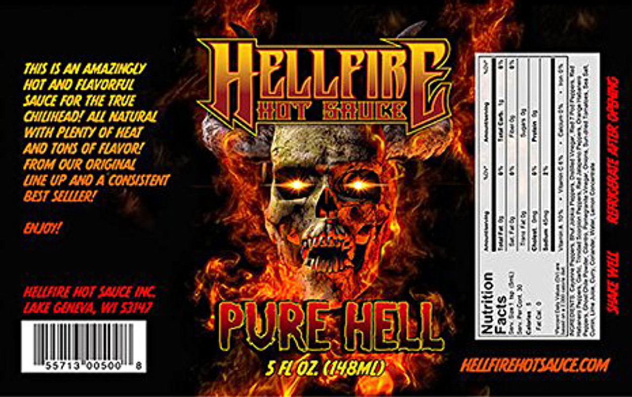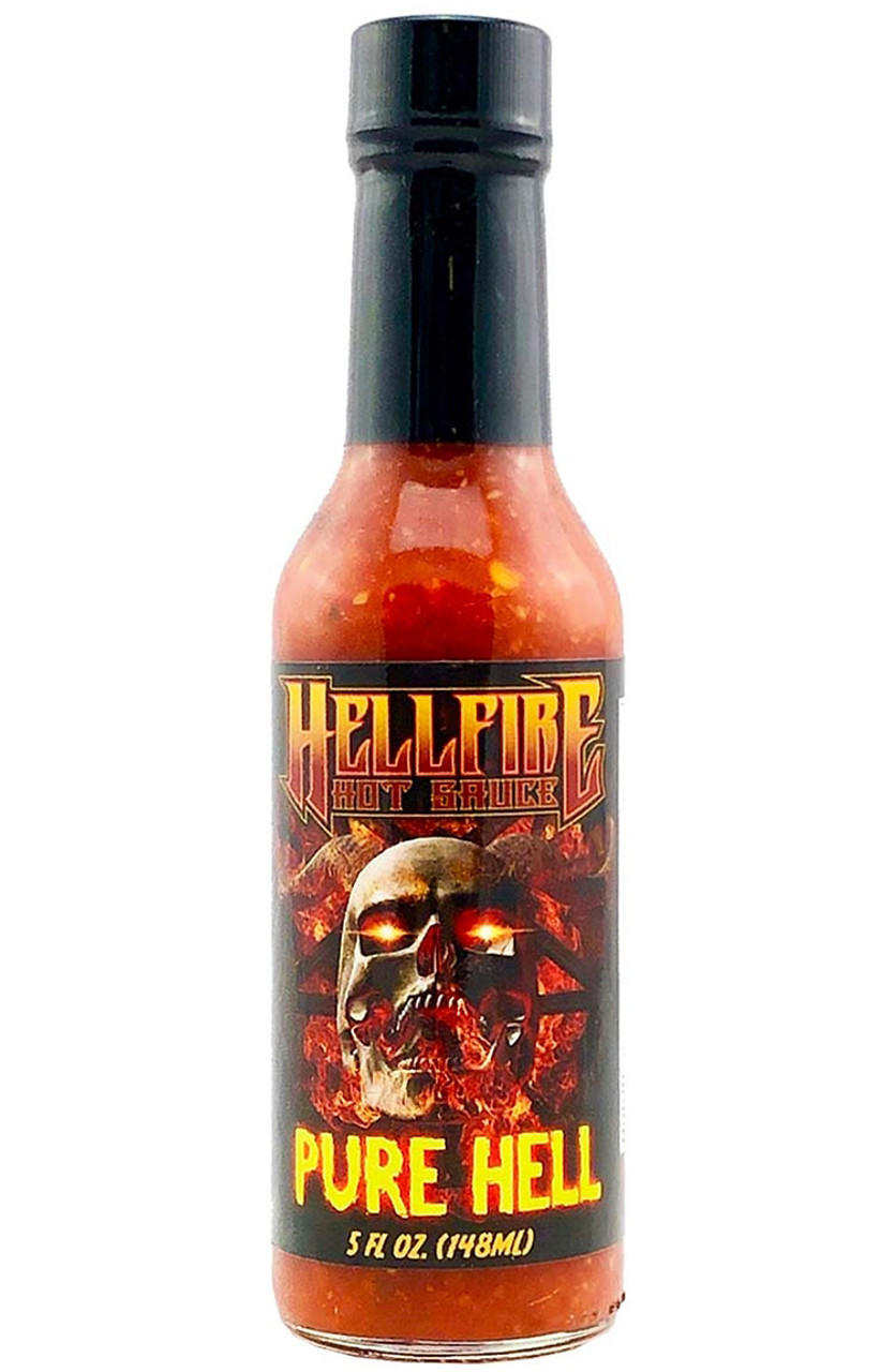 Hellfire Pure Hell Hot Sauce, 5oz.: Another multi award winning sauce! This is an amazingly hot and flavorful sauce for the true chilihead! All natural with plenty of heat and tons of flavor! From our original line up and a consistent best selller! This sauces is loaded with peppers including Bhut Jolokia, Red 7-Pot, Red Habanero, Trinidad Scorpions, Red Cayenne, Red Jalapeno and Orange Habaneros!!! Providing a most thorough and complete burn!!! But it also has plenty of flavor from the garlic, onions, sun dried tomatoes, curry, corriander, lemon, lime, pomegranite, vinegar and sea salt!! A Classic! Enjoy!