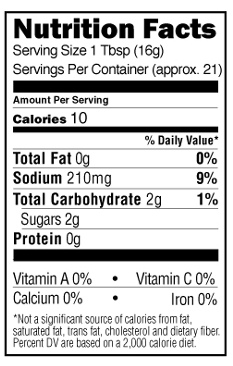 Ingredients: Water, Seasoning Blend [Brown Sugar, Salt, Granulated Onion, Natural Flavors (Corn Syrup Solids, Lime Juice, Lime Oil), Spices, Granulated Garlic, Whole Yellow Mustard Seeds], Distilled Vinegar, Organic Tamari Sauce (Water, Organic Whole Soybeans, Salt), Sugar, Apple Juice Concentrate, Spices, Contains Less than 0.5% of: Molasses, Ground Ginger (Ginger, Water, Phosphoric Acid, Xanthan Gum), Orange Peel, Xanthan Gum, Guar Gum, Malic Acid.