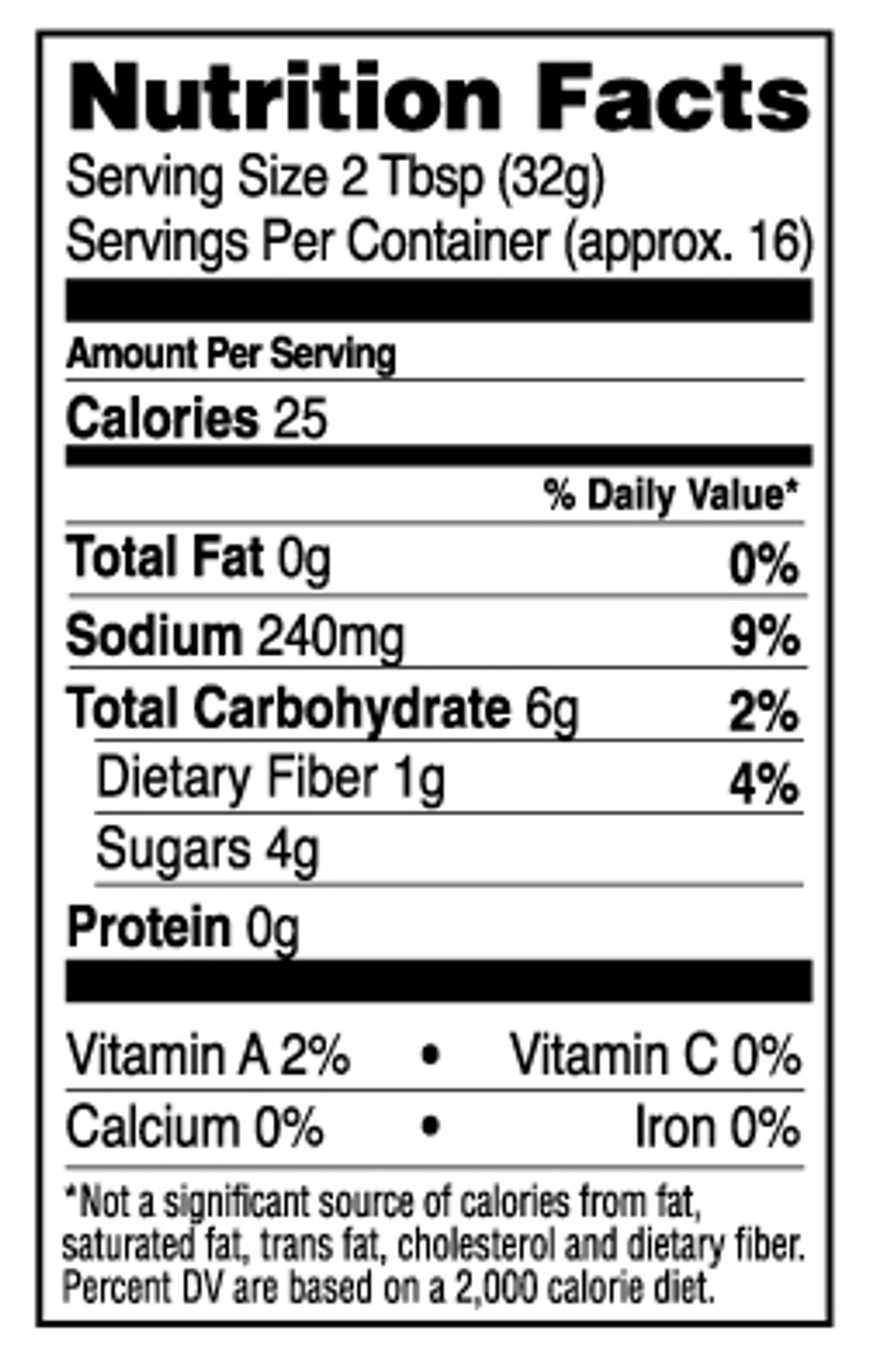 Ingredients: Water, Tomato Paste, Cane Sugar, Distilled Vinegar, Molasses, Tapioca Dextrin, Salt, Brown Sugar, Spices, Corn Starch, Contains less than 0.5% of: Onion, Paprika, Garlic, Chile Powder, Natural Smoke Flavor, Guar Gum, Xanthan Gum, Corn Syrup, Tamarind.