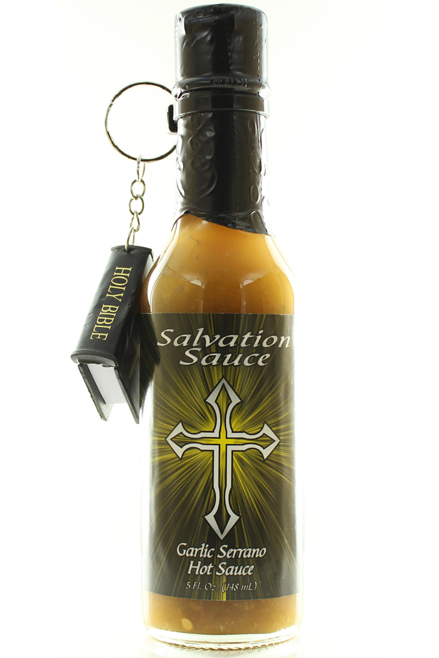 Danny Cash's Garlic Serrano Salvation Sauce (w/mini bible)(5oz./148ml) Salvation Sauce was started in a church kitchen on Denver's west side. Now part of a larger mission, it is sold nationwide raising money for youth groups, mission trips, and families in need.